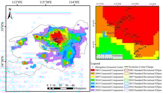 Figure 16a shows the weighted standard deviation ellipses obtained using the GDP spatializing data for the first level of the connected components in Zhengzhou, and Figure 16b shows the economic center changes and changes in the trends of the economic center in Zhengzhou. Table 2 shows the parameter information of the economic center in Zhengzhou from 2001 to 2020. From Table 3, it can be seen that the overall economic center of Zhengzhou was relatively stable between 2001 and 2020, the economic center longitude changed from 113°33′E to 113°40′E, and the latitude changed from 34°39′N to 34°46′N. The economic development trend of Zhengzhou was roughly the same as the overall development trend of Henan Province. Between 2001 and 2020, the overall change trend of the economic center of Henan Province and Zhengzhou was to change toward the southeast. Among the 19 annual economic center shifts, the economic center moved to the southeast 9 times, the northwest 2 times, the southwest 5 times, and the northeast 3 times. Compared to the “back and forth” change trends in Henan Province, the Zhengzhou trend was more intuitive and obvious. In the past 20 years, the economic center of Zhengzhou has moved southward 14 times, and the direction of change of the economic center has shifted to the southeast 9 times. This has much to do with the topography and development of Zhengzhou. To the north of Zhengzhou is the Yellow River Rift Valley, which is not navigable and has no economic value. The western side of Zhengzhou is mountainous and hilly, and the cost of development is too high. Luoyang is 140 km away from Zhengzhou, making it difficult to form a linkage development. Southeastern Zhengzhou is flat and suitable for large-scale urban development and construction, thus creating a situation in which Zhengzhou continues to develop in a southeastern direction.
