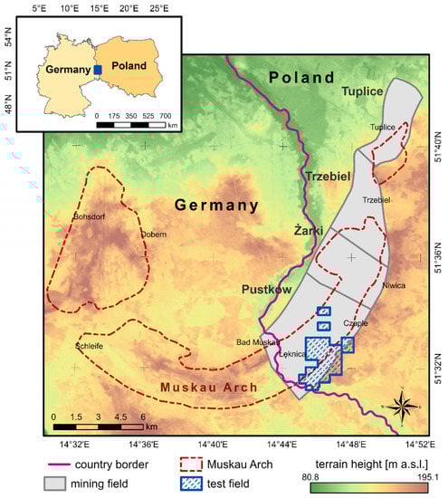 Location of the test fields against the background of the Muskau Arch and the mining fields of the Babina mine (terrain topography was obtained on the basis of 1′’ Digital Elevation Model (DEM) Shuttle Radar Topography Mission (SRTM)).