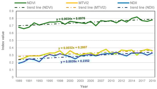 The first stage of the research was aimed at the analysis of the average annual values of the NDVI, NDII, and MTVI2 indices. As shown in Figure 2, an increase in the values of all of the analyzed indices was observed in the 1989–2019 period (the average values of all spectral indices increased by approximately 0.15 over the 30-years period). The values for 1997, 2002, 2008, and 2015 were not analyzed as the images available for these years did not meet the minimum cloud cover criterion.