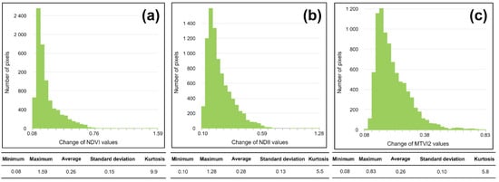 Histograms of dependent variables: (a) Change of NDVI values; (b) Change of NDII values; (c) Change of MTVI2 values.