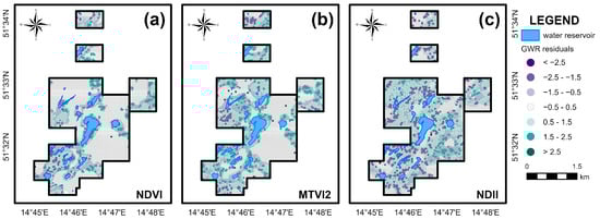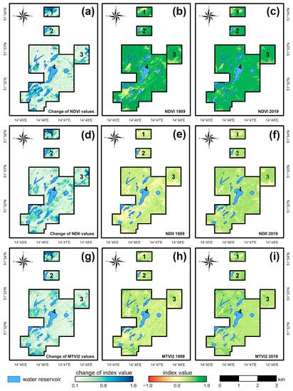 A unique aspect of the research arises from the fact that the study area was subjected to long-term, combined, underground, and open-cast mining in complex glaciotectonic conditions. The mineral extraction ended in the 70s of the 20th Century, and the area now constitutes a part of the UNESCO Global Geopark “Muskau Arch.” The background of this study also lies in the fact that numerous secondary effects of former mining activity, such as sinkholes, subsidence basins leading to localized waterlogging, and waste heap weathering have been observed there. Up to this date only limited in situ investigations have been conducted in the study area [,,,,], and our work is the first research that utilizes remotely sensed multispectral satellite imagery and GIS. Time-series analysis (1989–2019) of the following vegetation indices: Normalized Difference Vegetation Index (NDVI), Modified Triangular Vegetation Index-Improved (MTVI2), and Normalized Difference Infrared Index (NDII) was applied to study vegetation condition in the post-mining period. Then we used algebra and multivariate, spatially weighted regression methods to identify zones of significant changes of flora condition and to analyze the statistically significant driving factors behind these changes. The proposed methodology can be applied to a long-term analysis of vegetation condition in other lignite mining and post-mining areas with similar spatial and temporal characteristics.