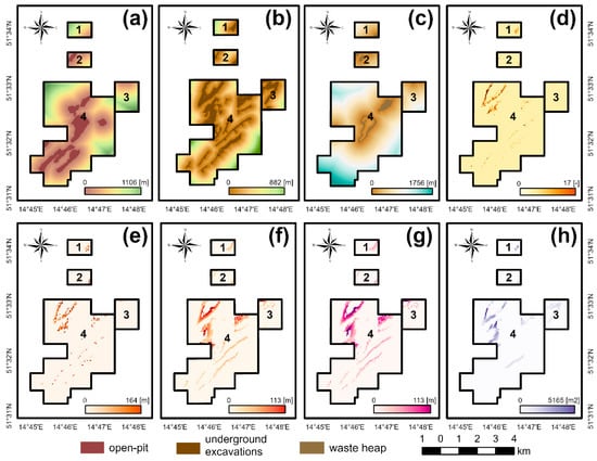 Independent variables—mining factors: (a) Distance from former open pits; (b) Distance from the underground workings; (c) Distance from the mining waste heaps; (d) Number of the mining shafts per pixel; (e) Average depth of the mining shafts; (f) Average depth of the underground excavations; (g) Minimum depth of the underground excavations; (h) Area of the underground mining excavations per 1 pixel.