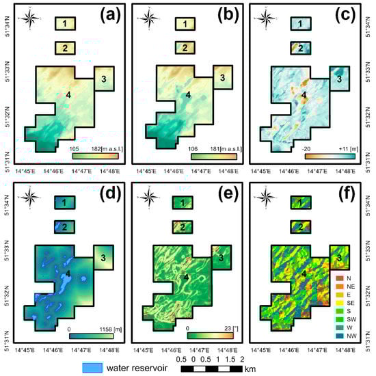 The former open pits were located in fields no. 2 and 4. These are now anthropogenic lakes. The spatial distribution of the distance to former open pits is presented in Figure 6a.