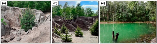 The glacial processes led to the exposure of lignite deposits, which contributed to the beginning of mining operations within the whole of the Muskau Arch. In the now Polish part of this structure, mining began in the second half of the 19th Century. The “Babina” mine started its operation in 1921 and was the largest one in the area. Both underground and open-cast mining methods were used due to the complexity of the folded lignite seams []. These unfavorable geological-mining conditions had also been the cause of the closing of the operation in 1973 due to economic reasons. Restoration of the post-mining area, aimed at the flooding of the old open pits and reforestation of the ground, started soon afterward []. Presently, the dominant plant species are pine forests, as well as alder and riparian forests. In total, over 1500 species of vascular vegetation, including ruderal and replacement plants, have been classified in the post-mining area []. The region was declared a Global UNESCO Geopark in 2015 because of the unique anthropogenic landscape that includes anthropogenic lakes with a low pH level and high Fe content, waste heaps and relics of mining infrastructure, as well as geological settings (valleys formed by glacial erosion, hills made of glacial erratic boulders, sands, and gravels, and gizers—ditches formed by weathering and subsiding of exposed lignite outcrops) [,,].