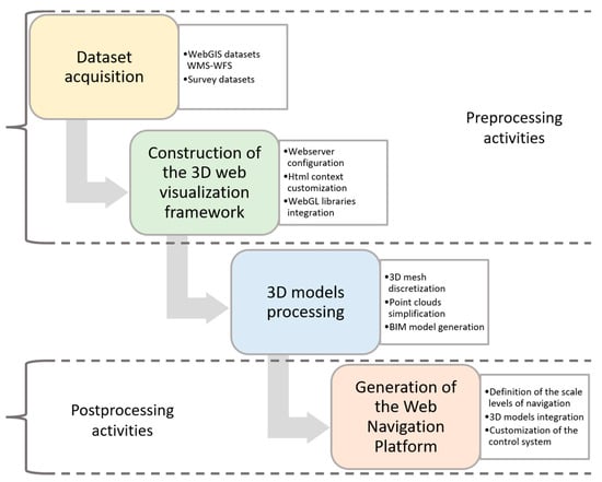 Platform development workflow. The dataset acquisition and the construction of the 3D web visualization framework constitute the preprocessing steps. Instead, the generation of the Web Navigation Platform regards the post-processing activities, when the processed 3D models are integrated inside it. Source: author.
