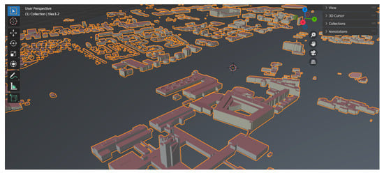 The 3D obj models of the neighborhood’s buildings loaded from the 3D BAG dataset. Source: author.