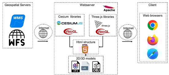 - Devaux, A.; Brédif, M.; Paparoditis, N. A web-based 3D mapping application using WebGL allowing interaction with images, point clouds and models. In Proceedings of the 20th International Conference on Advances in Geographic Information Systems (SIGSPATIAL ’12) 2012, Redondo Beach, CA, USA, 6–9 November 2012; Association for Computing Machinery: New York, NY, USA, 2012; pp. 586–588. [Google Scholar] [CrossRef]