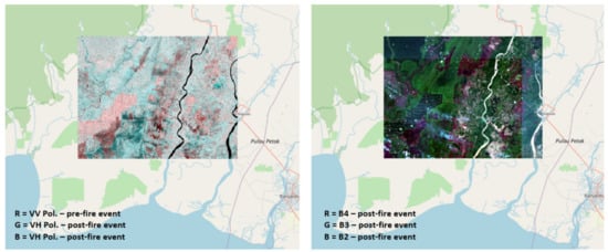Sentinel-1 and Sentinel-2 data were selected in this research using Google Earth Engine. The multi-temporal data were used to avoid pixel gaps in the cloud cover area. In selecting the data, the percentage of cloud cover was considered since it influences the data quality; therefore, the optical remote sensing data used in this research has a cloud cover percentage of less than 20%. Table 1 shows Sentinel-1 and Sentinel-2 data specifications used in this research. For pre-fire and post-fire events, we mosaicked cloudless Sentinel-2 data on 5–30 July 2019, and 8–23 October 2019, respectively. Mosaic SAR images of pre-fire events were taken on 6–23 July 2019, and 10–27 October 2019, for post-fire events from Sentinel-1 data. Figure 2 shows mosaic images of SAR and optical remote sensing data that were used in this research. The RGB SAR images are composed of VV polarization in pre-fire events and VH polarization in post-fire events, while RGB optical images are composed of B4, B3, and B2 in post-fire events.