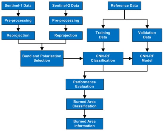 The proposed methodology of this research is described in Figure 3. It consists of several main sections, including image pre-processing, band and polarization selection, training and validation data production, classification, model evaluation, and burned area calculation.