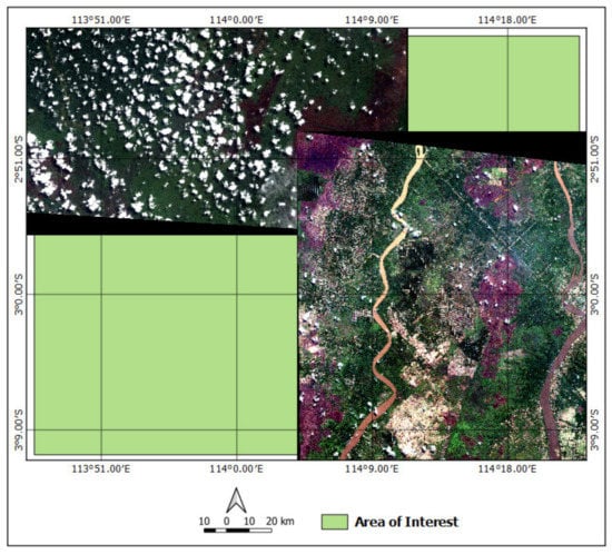 A part of the region of Pulang Pisau Regency and Kapuas Regency, Central Kalimantan, Indonesia (Figure 1), was selected as the research area as it has been one of the most affected regions in the last three years [4]. The land cover in this area comprises plantations, shrub swamps, and crops [39]. The size of the research area is approximately 344,600 hectares.