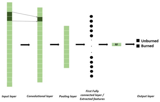 The combined CNN and RF (CNN-RF) architecture is shown in Figure 6, which consists of an input layer derived from the image bands, a convolutional layer, a pooling layer, and a fully connected layer. The output of the first fully connected layer is the result of features extracted and then used as input for the classification of the burned area using the RF method.
