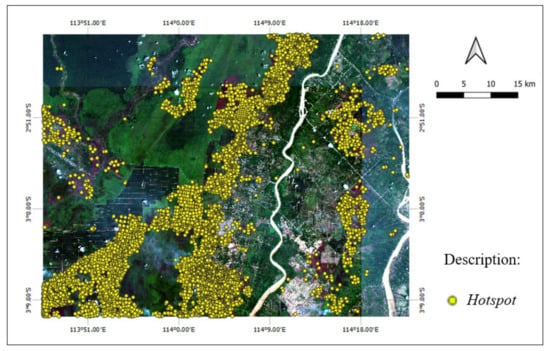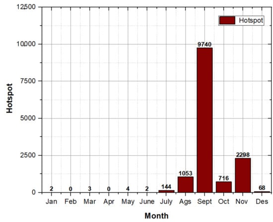 Based on MODIS and VIIRS sensors, the number of hotspots in the research site throughout 2019 with a medium to high confidence level is 14,030 spots, as shown in Figure 9, with the peak of fire incidence in September 2019, with as many as 9,740 spots. On the basis of the spatial resolution of the MODIS sensor for each hotspot pixel, the MODIS MCD64A1 correlates with the maximum extent of the burned area of 53,836 hectares. The results of the hotspot distribution pattern at the research location are shown in Figure 10. The distribution results can be used as supporting data to determine the time and location of the burned area.