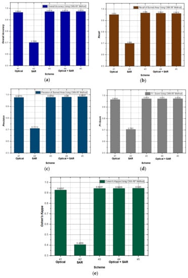 Table 3 shows the performance comparison of the burned area classification model for Schemes #1–#5, with parameters such as OA, recall, precision, F1-score, and K. Based on Table 3, the highest OA and K values were found in the CNN-RF method in the tested schemes, except in Scheme #2. The highest values are printed in bold.