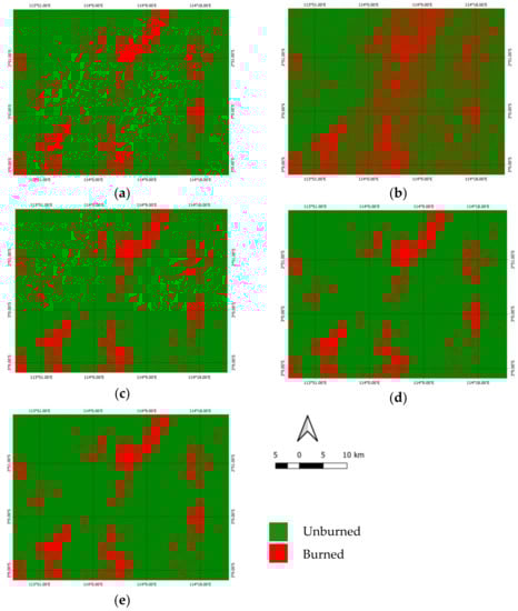 The model in Schemes #1–#5 was then applied to classify the research site. These results for each scheme are shown in Figure 11a–e. In Scheme #2, SAR remote sensing data classified burned areas for the large-scale area (>300 hectares). The pattern of the burned area is shown in Figure 11b so that it can be used as supporting data for mapping burned areas. However, there were still high commission and omission errors that need to be improved. In addition, this integration method should be tested in other land cover types outside of this research’s area of interest since burned area product from SAR data is influenced by land cover types such as grassland [49].