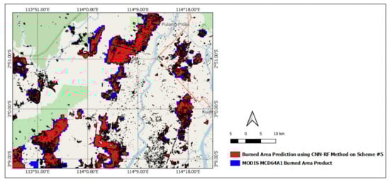 As burned area information from the field survey is in the form of coordinate points, MODIS MCD64A1 burned area product was used as a comparison. Figure 14 compares burned area result prediction using the CNN-RF method on Scheme #5 and MODIS MCD64A1 burned area product. Using the same reference projection system, burned area estimation from MODIS in the area of interest was 53,836.08 hectares. It shows that the obtained burned area estimation using the CNN-RF method had 89–90% agreement with MCD64A1 burned area product for Schemes #1, #3–#5. However, the burned area estimation using SAR remote sensing data for all tested methods in Scheme #2 tended to be larger than optical remote sensing data or combined optical and SAR data. The burned area proportion from the MODIS MCD64A1 products was 47–55% of those obtained from this research.