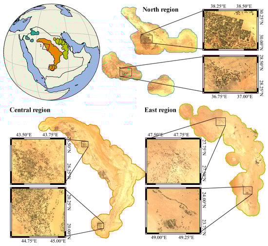 Located between latitudes N and N and longitudes E and E, Saudi Arabia occupies around 80% of the Arabian Peninsula. With annual rainfalls averaging 100–120 mm/year (mainly from October to May) and daily maximum temperatures exceeding 45 C during the summer months, Saudi Arabia is one of the driest regions worldwide []. Johansen et al. [] determined that there were 11,555 km of center-pivot fields distributed across Saudi Arabia in 2015, the majority with sizes ranging from 200 to 500 m in radius. That study focused on the main agricultural regions of Al Jawf, Tabuk, Ha’il, Al Qassim, Riyadh, Wadi ad-Dawasir, and the Eastern Province []. The dominant crops reported in the statistical yearbook 2019 were foraged crops (mainly alfalfa), cereals (mainly wheat, barley, and broom-corn), vegetables (mainly watermelon, potato, and tomato), and fruits (mainly dates, citrus, and grapes) []. In this study, the abovementioned administrative units were grouped into three major geographical regions: the north region (Tabuk and Al Jawf), the central region (Ha’il, Al Qassim, Riyadh, and Wadi ad-Dawasir), and the east region (agricultural regions within the Eastern Province) (Figure 1). Spatial variations between different regions were observed, including larger fields and more uniformity in the north and east regions and more variability in the field area and shapes in the central region []. Given the predominance of center-pivot systems (both circular and fan-shaped) operating within the agricultural fields of the Kingdom, these were the primary focus of analysis herein. That decision was also made in part due to the limitations of 30 m resolution Landsat pixels being able to accurately capture field boundaries. Furthermore, it is noted that the term “center-pivot fields” is often used interchangeably with “fields” throughout the text.
