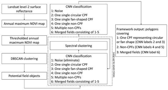 As the study by Li et al. [] performed well when using different satellite data and produced a high object-based producer’s accuracy of 97% and user’s accuracy of 98% when assessed against 4000 manually identified fields, that framework was further explored herein. Revisiting that approach, three machine learning techniques, i.e., DBSCAN [], CNNs classification [], and spectral clustering [] were operated in sequence herein to identify and delineate the center-pivot fields, with the schematic showing in Figure 2. The following provides a brief overview of the technique, with the reader directed to Li et al. [] for a more detailed description of the hybrid machine learning framework. As a first step, the annual maximum NDVI map was obtained using NDVI maps calculated from Landsat Level-2 surface reflectance imagery for each target year. A thresholded NDVI map was obtained by eliminating pixels with NDVI values below a threshold value, i.e., 0.25 herein, which were mainly bare soil background pixels. Then, pixels from annual maximum NDVI maps were segmented into potential field objects using DBSCAN. The type of the field objects was further classified into six categories by a classic CNN approach, i.e., AlexNet, including circular center-pivot field (CPF), fan-shaped CPF, non-CPF (fields presenting rectangle shapes), multiple non-CPFs, merged fields, and noise. Next, the merged fields and multiple non-CPFs were re-clustered into individual fields by spectral clustering. The CNN classification and spectral clustering can be run up to seven iterations to cluster the multiple fields into individual fields or until no field object was identified as merged fields. Finally, polygons were created for each cluster representing individual field masks. We group both circular and fan-shaped fields as one in the final result because the shape of the field was not of interest in this study.
