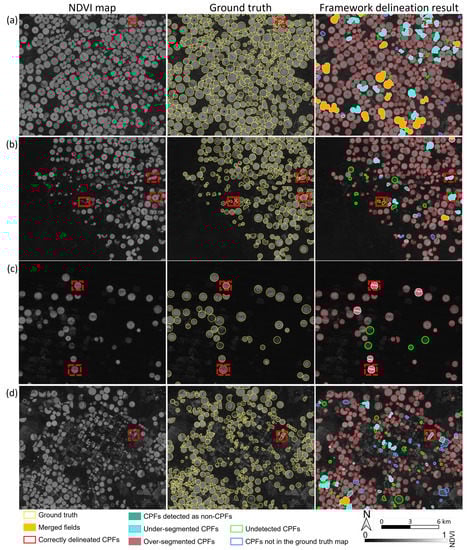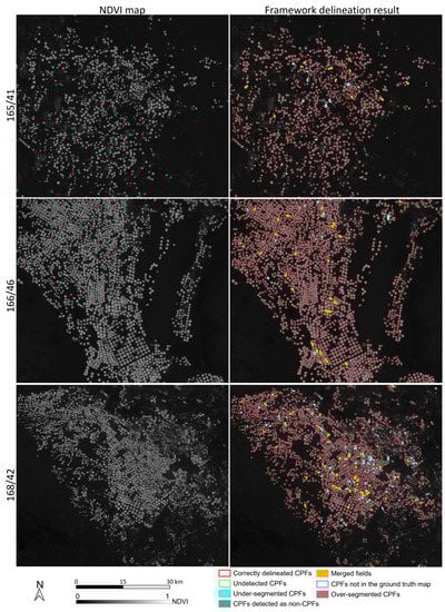 The number of fields that failed to be detected as CPFs was also counted, including CPFs detected as non-CPFs representing rectangle shapes (Table 3; ) and undetected CPFs (Table 3; ) defined as a union of CPFs (1) being identified as noise by the CNN, and thus excluded by the framework, (2) not intersected with any framework-delineated fields, or (3) with both the and values higher than 40%, under which circumstances the framework-delineated field and ground-truth field were treated as two different fields. was equivalent to: