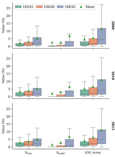 The delineation results were also assessed at the pixel level. The producer’s accuracy at the pixel level was generally higher than at the object level (Table 3) due to delineation errors being more likely to occur for small fields, resulting in a smaller proportion of pixels than the number of fields being identified incorrectly. The boxplots of the , , and IoU error values for the three evaluation tiles are shown in Figure 4. In general, the delineation results showed low over- and under-segmentation errors. The median values of , , and IoU error were less than 2.1, 0.9, and 5% for all the correctly detected fields (fields in Table 3; row 3). While the under-segmentation errors at the object level were higher than the over-segmentation errors, these indicated the number of fields with or values exceeding 40% (Table 3; rows 4 and 5). In contrast, the over-segmentation errors at the pixel level were higher than the under-segmentation errors (Figure 4), suggesting that a framework-delineated field was more likely to be smaller instead of larger than the ground-truth field. The difference between the mean and median values of was higher than that of , due to a larger number and magnitude of outliers for the values, i.e., more fields were being under-segmented, which was consistent with the object-based analysis. Tile 168/42 showed more segmentation errors than the other two tiles, which can be explained by the more complex agricultural parcel distributions in this region compared to the other two tiles, i.e., the central region contains a larger number of smaller, irregularly-shaped fields, with less spacing between them (Figure 3). Johansen et al. [] also reported lower accuracies in this region compared to other regions in Saudi Arabia, albeit using a different object-based image analysis technique. Indeed, the complex field conditions played a more significant role than the data source, e.g., the data striping in Landsat-7 did not result in more fields being over-segmented in tile 168/42 in 2010 compared to 2015 (Figure 4 and Table 3).