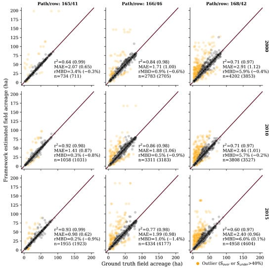 Comparison of the acreage of the ground-truth fields (x-axis) and framework-delineated fields (y-axis) for the three evaluation tiles and in 2000, 2010 and 2015. The color indicates whether the center-pivot field was delineated correctly (black) or identified as an outlier (orange), based on either the or the metric being over 40%. The transparency of each color (e.g., from black to gray) represents a change in the density of data points from high to low. The figure also shows some correlation metrics using all the data (black and orange) and using only the correctly delineated fields (black), corresponding to the number within round brackets. , MAE, and rMBD represent the coefficient of determination, the mean absolute error, and the relative mean bias deviation, respectively, and n indicates the number of center-pivot fields included in the scatterplot. The red lines indicate the x = y (1:1) line.