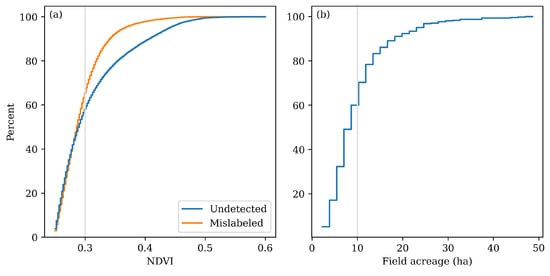 Distributions of (a) NDVI values for center-pivot fields (CPFs) not detected by the framework (fields in Table 3; row 8) and CPFs mislabeled as non-CPFs (mislabeled, fields in Table 3; row 7), and (b) field acreages of mislabeled CPFs being detected as non-CPFs. Non-CPFs indicated fields showing rectangle shapes.