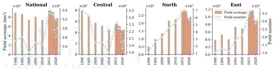 The central region (location shown in Figure 1) represented the hub of the agricultural development at the start of the study period, with 92% of the fields located within this region in 1990. That percentage decreased during the next two decades, although the central region still represented the majority with at least 68 and 56% in the number and acreage of the fields located therein in both 2017 and 2018. The trends in the northern and eastern regions were opposite to the central region for the first two decades (1990–2010), with those areas seeing an increasing number of fields and total acreage. The year 2016 represented a key point in the multi-decadal trends. As observed for the national estimates, both the north and east regions reached a maximum extent of fields. For the central region, 2016 also represented a local maximum extent of 5419 km (23,330 fields) following the previous decreasing trend: although this was still much lower than the 1990 values, which comprised approximately 25,017 fields covering 7974 km. More generally, the dynamics over the 6 years from 2015 to 2021 were similar for all the regions, witnessing a sharp decrease in agricultural development, with the largest change occurring from 2018 to 2019 as highlighted for the national estimates.