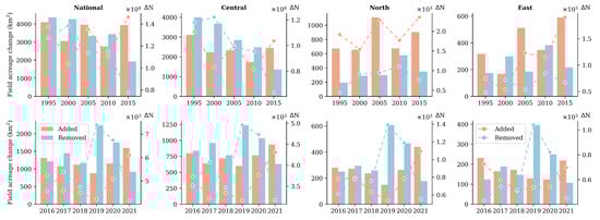 The change (added/removed) in total fields acreage (left y-axis related to bars) and the number of fields (N; right y-axis related to dashed lines) compared to the previous study year: every 5 years from 1990 to 2015 (top panel), and every year from 2016 to 2021 (bottom panel), at the national scale (left) and for each of the three regions (i.e., the central, north, and east regions as shown in Figure 1).