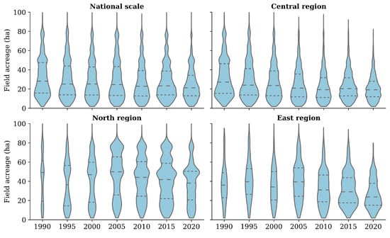 The violin plots showing the field acreage distribution every five years from 1990 to 2020 at the national scale of Saudi Arabia and for the three sub-regions (i.e., the central, north, and east regions as shown in Figure 1). The dashed lines represented quartiles.