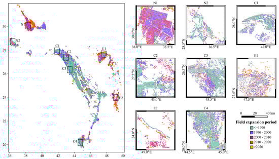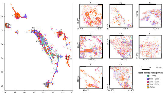 The framework is also able to generate important spatiotemporal information such as field expansion and contraction maps (Figure 11 and Figure 12) and associated field acreage changes (Figure 13).These maps—generated at the pixel level—show the time at which a field was first detected and the year for which a field was last detected, respectively. Nationally, most of the fields were already installed by 1990 and were mostly within the central region (green color in Figure 11), with a total acreage of 8841 km (Figure 13). A second expansive period was observed from 1991 to 1995, during which approximately 4095 km of fields were added. In the north region-particularly in Al Jawf-the period from 2000 to 2010 also saw a significant expansion for field development, representing 1487 km and accounting for 40% of the total expanding acreage after 1990 (Figure 11-N1 and Figure 13). Within the east region, the expansion of the fields occurred more sporadically over time (Figure 11-E1 and E2, and Figure 13). By contrast, most of the field phasing-out activities occurred after 2015 for all the regions (Figure 12 and Figure 13).