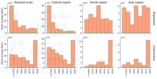 There were some interesting temporal trends related to field contraction. For example, around 2235 km of of the fields that were detected in 1990 were no longer detected in all the ubsequent years (Figure 13), with the majority of such cases observed in the central region (green color in Figure 12). Such field contraction showed a decreasing trend with 338 km of field acreage removed on average every five years until 2015 before peaking from 2016 to 2020, when around 4641 km of the fields were abandoned at a national scale. A similar trend in the field contraction values was observed within the central region, which was not surprising, as it covers a significantly larger area (68 to 92% of the total field acreage) relative to the other regions. The field contraction trends were similar in the north and east regions, with relatively low contraction values prior to 2015, and large values after 2015, resulting in 1052 and 725 km of eliminated fields between 2015 and 2020, respectively (Figure 13).
