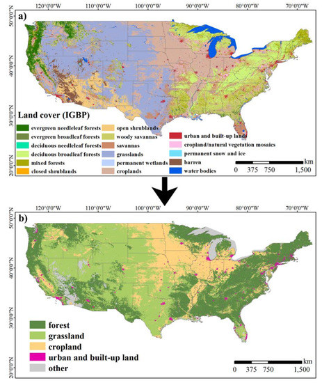 Land cover types in the conterminous United States, where (a) denotes the IGBP classification scheme, and (b) denotes the four categories required for this study.