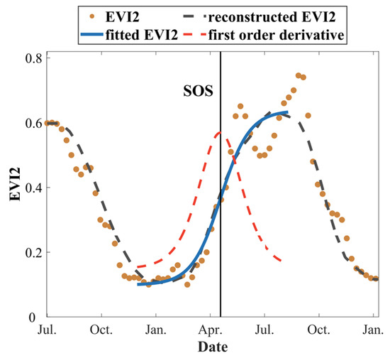 We used the widely accepted first-order derivative method (Figure 3) [27,28,55,56] to extract the timing of annual SOS (2001–2021) from the fitted EVI2 time series in the conterminous United States. In general, the fastest increasing point in the vegetation index time series curve indicates the beginning of vegetation growth. Here, SOS is defined as the date corresponding to the maximum slope in the fitted EVI2 curve. In other words, SOS is the date when the first local maximum occurs in the first-order derivative curve of the fitted EVI2 time series. The unit describing SOS is day of year (DOY).