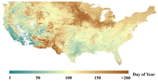 Figure 4 shows the mean SOS in the conterminous United States from 2001 to 2021 retrieved using the first-order derivative method. Overall, SOS gradually advances from north to south. However, in the Great Lakes, Middle Atlantic, and Southwest of the conterminous United States, the timing of mean SOS (generally later than DOY 140) is later than in the surrounding areas, while the timing of mean SOS (generally earlier than DOY 90) in the Pacific Coast region is earlier than in the surrounding areas.