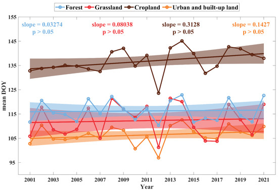In this study, we simply extracted four categories (i.e., forest, grassland, cropland, and urban and built-up land) according to the IGBP classification scheme in the MCD12Q1 product. Due to the coarse spatial resolution (500 m), MCD12Q1 is not designed to be used for mapping land cover changes [65]. The purpose of this paper is not to precisely extract the land cover types in the study area, but to simply extract the land surface spring phenology trends of representative areas in terrestrial ecosystems. For example, forests and grasslands are the dominant vegetation types on the land surface, and the vegetation phenology on cropland and urban areas is largely driven by human activities. In particular, urban heat islands and highly heterogeneous surface climate conditions differentiate the phenological characteristics of vegetation in the urban from that in surrounding areas [66,67,68]. While no significant trends in annual mean SOS were observed across the four land cover categories, there were large intra-annual differences between categories (Figure 7). Specifically, the earliest SOS occurred in the urban and built-up land areas, while the latest was in the cropland areas. The SOS of forest areas was slightly later than that of grassland areas. There may be multiple reasons for these differences. In addition to natural factors, human activities have a very important influence on the land surface spring phenology. For example, it has been found that SOS is earlier in urban areas than in the surrounding area, and that a tenfold increase in urban size leads to an earlier SOS of approximately 1.3 days [68]. Moreover, SOS in cropland areas depends on the date of human sowing, changes in tillage practices, and changes in crop varieties [4].