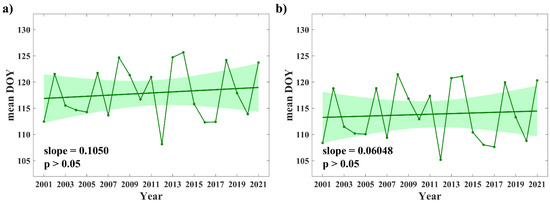 Considering that the annual mean SOS of cropland is significantly later than the annual mean SOS of other land cover types, we extracted the temporal trend of the annual mean SOS of the study area under two scenarios (i.e., including and excluding cropland) (Figure 8). The trend was calculated at the 95% confidence level. Figure 8a shows the annual mean SOS trend from 2001 to 2021 that include cropland. The mean SOS exhibited an insignificantly delayed trend (p > 0.05) with 0.1050 days/year from 2001 to 2021. Figure 8b shows the annual mean SOS trend from 2001 to 2021 that exclude cropland. The mean SOS exhibited an insignificantly delayed trend (p > 0.05) with 0.06048 days/year over the past 21 years. The ranges of SOS interannual variation for the two scenarios were 17.52 days and 16.31 days, respectively. The annual mean SOS including cropland was generally later than the annual mean SOS excluding cropland, ranging from 2.7 to 5.4 days.