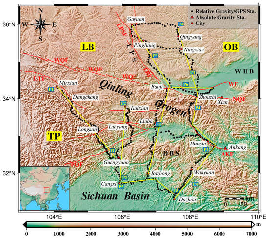 Map of the study area showing topography and the distribution of the gravity/GPS stations in the Qinling Area. The red square in the subfigure in the bottom left corner shows the geographical position of the study area in China. The black dots indicate the geographical positions of the measurement stations. Red triangles denote absolute gravity stations. Red dots denote cities. P1–P6 denote observation profiles, the start and end points of each trace of P1–P6 on the map are connected by a yellow line. Red lines are faults. WQF: Western Qinling fault, LPSF: Liupanshan fault, LBF: Longxian-Baoji fault, WF: Weihe fault, NQF: North Qinling fault, LTF: Lintan-Tanchang fault, PQF: Pingwu-Qingchuan fault, and AKF: Ankang fault. Abbreviations for tectonic units are as follows. OB: Ordos Basin, LB: Longxi Block, TP: Tibetan Plateau, WHB: Weihe Basin, DBS: Dabashan, and LPS: Liupanshan Mountains.