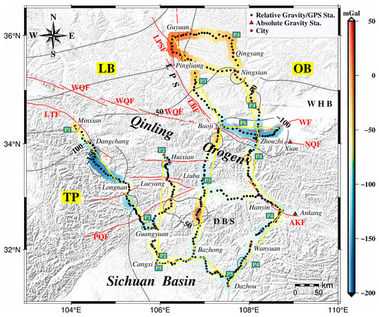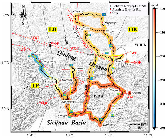 The gravity and GPS hybrid observation datasets that we use in this study were performed from two measurement phases (Figure 1). One part of our observation in July 2021 included 265 observation stations, and another part in July 2022 included 144 observation stations. Observation stations were selected from stable foundation, flat, and easy access locations. We conducted an out-and-back procedure to gather observation data to minimize errors, that is, 1 → 2 → 3 → … → 3 → 2 → 1 [29]. All stations are linked to the absolute gravity stations at Xian, Ankang, and Guangyuan. In order to reduce the observation error, the distance between two adjacent measuring stations was approximately 6–10 km. Gravity data were then adjusted using the software named LGADJ of the China Earthquake Administration [30], and observation stations absolute gravity values were calculated from the three sites of Xian, Ankang, and Guangyuan. The overall accuracy of the gravity data is 0.02 mGal.