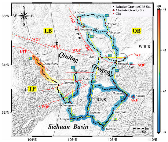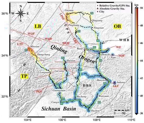 - Wang, Z.; Fu, G.; She, Y. Crustal Density Structure, Lithosphere Flexure Mechanism, and Isostatic State Throughout the Qinling Orogen Revealed by In Situ Dense Gravity Observations. J. Geophys. Res. Solid Earth. 2018, 123, 10,026–10,039. [Google Scholar] [CrossRef]