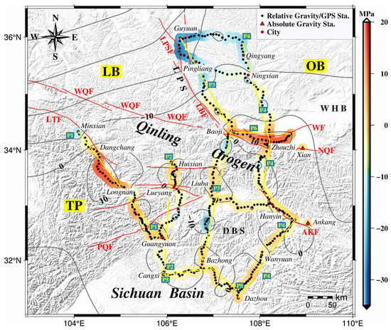 The isostatic additional force is calculated by Equation (7), and the results are shown in Figure 8. We show the results close to the observation stations in color and far from the observation stations in contours. It should be noted that the Moho depth is greater than the isostatic depth, which indicates upward positive isostatic additional force. The Moho depth is less than the isostatic depth, and the downward negative isostatic additional force will be produced in order to satisfy equilibrium. From the contents of Figure 8, the pattern of the isostatic additional force distribution in the study area is relatively similar to the isostatic anomaly (Figure 7). In the area south of 32°N, the isostatic additional force is almost zero. The negative isostatic additional force appears in the Liupanshan Mountains, the southwest margin of the Ordos Basin, and the local areas of Qinling Orogen and Dabashan, while the Weihe Basin and the area from Guangyuan to Dangchang indicate obvious positive isostatic additional force value. The isostatic additional force gradient varies dramatically on both sides of the North Qinling fault, with a large positive isostatic additional force of about 20 MPa in the Weihe Basin to the north and a negative isostatic additional force in the Qinling area to the south.
