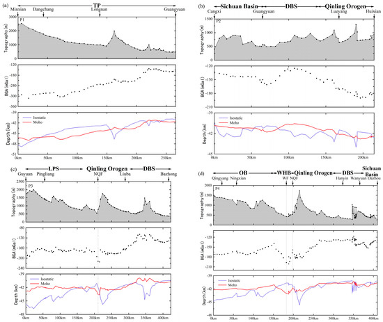 Topography, measured gravity anomalies, inverted Moho depth, and isostatic depth along four profiles; (a) P1, (b) P2, (c) P3, and (d) P4. Abbreviations are the same as those used in Figure 1.