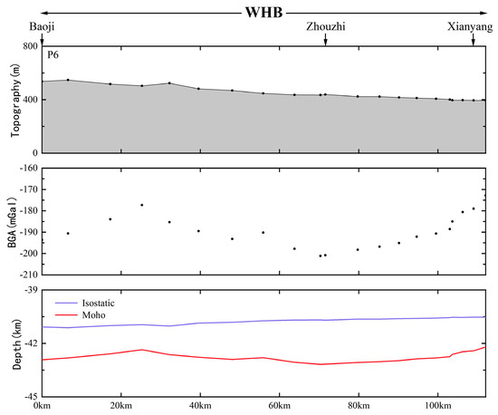 Topography, measured gravity anomalies, inverted Moho depth, and isostatic depth along profile P6 in Weihe Basin. Abbreviations are the same as those used in Figure 1.