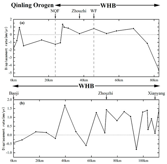 Displacement rate map of profiles P4 and P6 in Weihe Basin. (a) P4, and (b) P6. Abbreviations are the same as those used in Figure 1.
