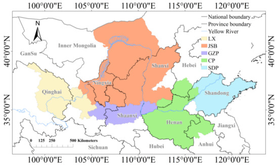 According to the “Planning Outline for Ecological Protection and High-quality Development in the Yellow River Basin” [44], it is proposed to divide the Yellow River Basin into five major urban agglomerations, as shown in Figure 1.