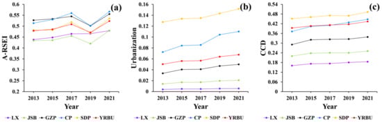 The dynamic change in the mean A-RSEI (a), Urbanization (b) and CCD (c) in the Yellow River Basin Urban Agglomeration (YRBU) and its sub-urban agglomeration (LX, JSB, GZP, CP, SDP), from 2013 to 2021.