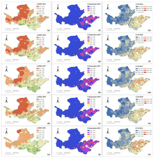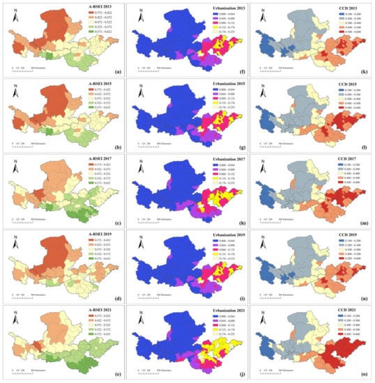 Spatial distribution in the Yellow River Basin Urban Agglomeration (YRBU) of the A-RSEI (a–e), Urbanization (f–j) and CCD (k–o), from 2013 to 2021, at county-scale perspective.
