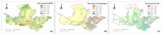 Spatial distributions in the Yellow River Basin Urban Agglomeration (YRBU) of the A-RSEI’s change rates (a), urbanization’s change rates (b) and CCD’s change rates (c) in the study area, during 2013–2021, at pixel-scale perspective.