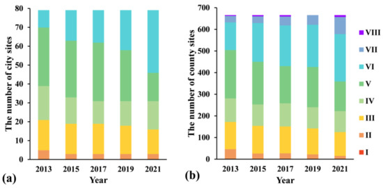 The statistical graph of the number of cities (a) and counties (b) with different CCD levels. (I) Extremely out of coordination. (II) Seriously out of coordination. (III) Medium dysfunction. (IV) Mild dysfunction. (V) Close to dysfunction. (VI) Marginal coordination. (VII) Primary coordination. (VIII) Moderate coordination.