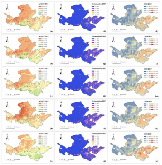 Spatial distribution in the Yellow River Basin Urban Agglomeration (YRBU) of the A-RSEI (a–e), Urbanization (f–j) and CCD (k–o), from 2013 to 2021, at pixel-scale perspective.