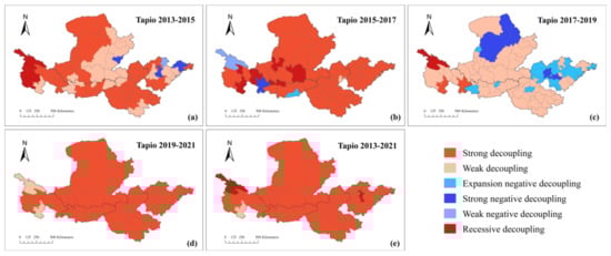 Decoupling distribution map in the Yellow River Basin Urban Agglomeration (YRBU), 2013–2015 (a), 2015–2017 (b), 2017–2019 (c), 2019–2021 (d), and 2013–2021 (e).