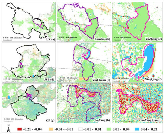 In addition, the eco-environmental quality of the regions with a higher degree of urbanization will be worse than that of the surrounding areas. For example, Qinling Mountains and Taiyue Mountains presents a negative change rate. Additionally, the areas in Guanzhong Basin show a lower eco-environmental quality compared with the surrounding areas (Figure 8).